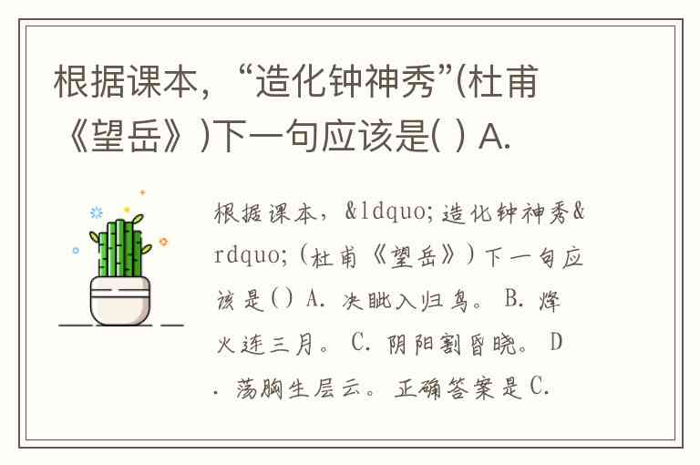 根据课本,“造化钟神秀”(杜甫《望岳》)下一句应该是( ) A. 决眦入归鸟。 B. 烽火连三月。 C. 阴阳割昏晓。 D. 荡胸生层云。
