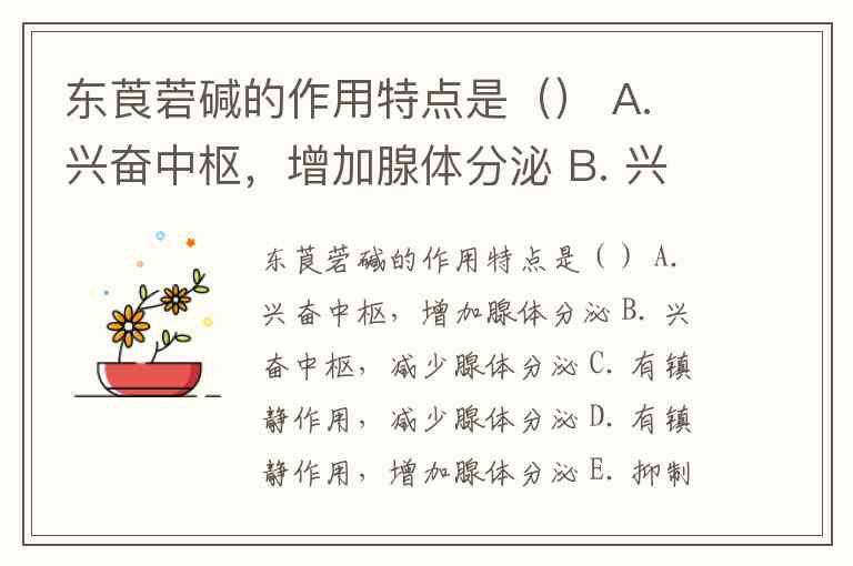 东莨菪碱的作用特点是() A. 兴奋中枢,增加腺体分泌 B. 兴奋中枢,减少腺体分泌 C. 有镇静作用,减少腺体分泌 D. 有镇静作用,增加腺体分泌 E. 抑制心脏,减慢传导