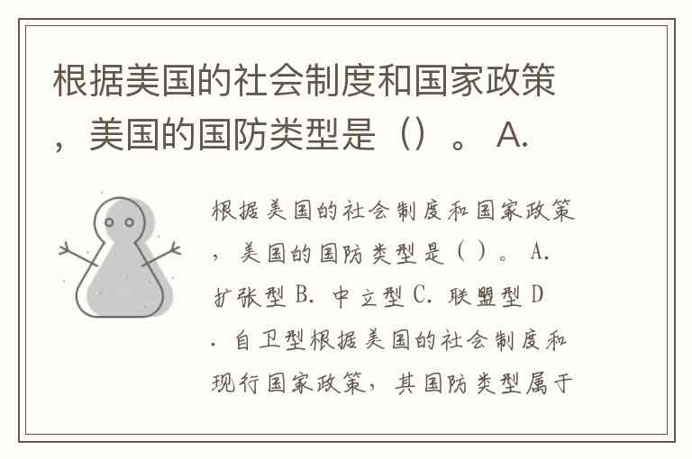 根据美国的社会制度和国家政策,美国的国防类型是()。 A. 扩张型 B. 中立型 C. 联盟型 D. 自卫型