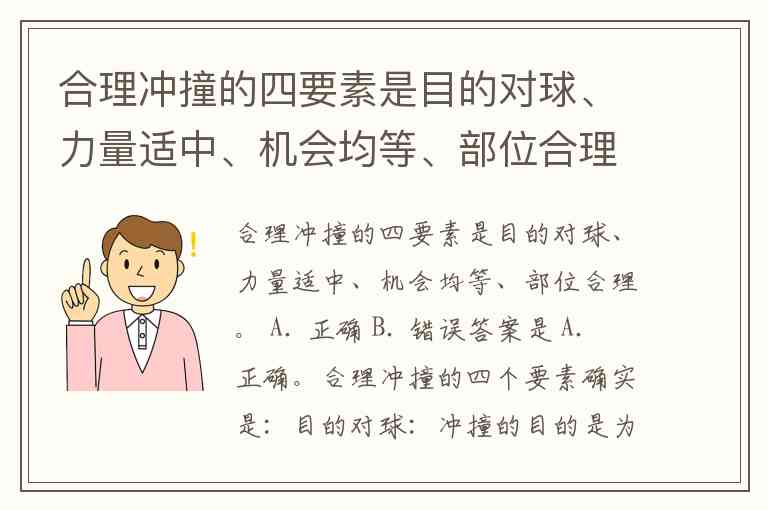 合理冲撞的四要素是目的对球、力量适中、机会均等、部位合理。 A. 正确 B. 错误