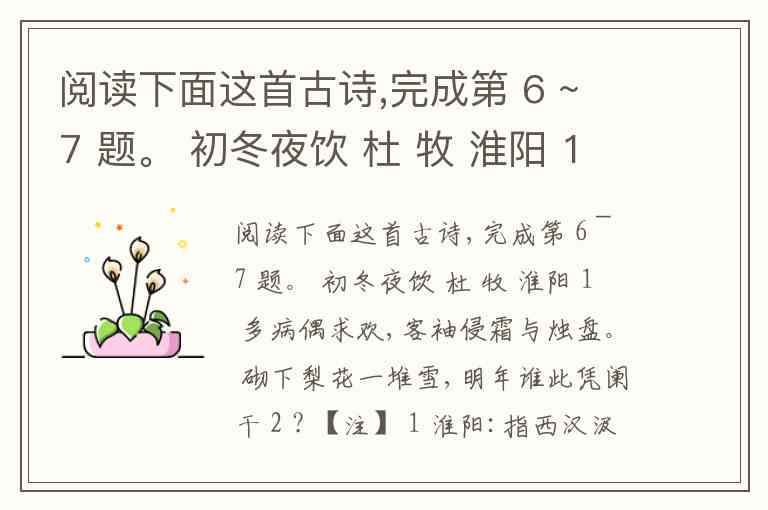 阅读下面这首古诗,完成第 6 ~ 7 题。 初冬夜饮 杜 牧 淮阳 1 多病偶求欢,客袖侵霜与烛盘。 砌下梨花一堆雪,明年谁此凭阑干 2 ? 【注】 1 淮阳:指西汉汲黯。 2 阑干:栏杆。 6 .下列对诗的内容理解不正确的一项是 ( ) A. “偶求欢”的“欢”,指代酒,暗点诗题“饮”字,表明诗人愁思郁积,难以排遣。 B. 第二句“客袖侵霜与烛盘”,进一步抒写作客他乡的失意情怀。 C. 前两句写诗人因多病而无眠,点烛独坐,第三句忽然插入写景。 D. “明年谁此凭阑干?”这一问,凝聚着诗人流转无定的困苦、思念故园的情思、仕途不遇的愤慨、壮志难酬的隐痛,是很能发人深思的。