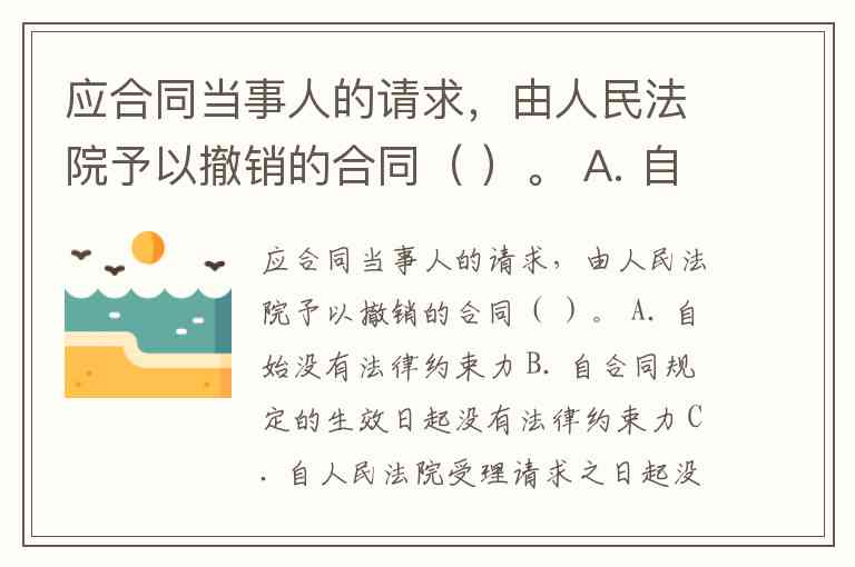 应合同当事人的请求,由人民法院予以撤销的合同( )。 A. 自始没有法律约束力 B. 自合同规定的生效日起没有法律约束力 C. 自人民法院受理请求之日起没有法律约束力 D. 自人民法院决定撤销之日起没有法律约束力