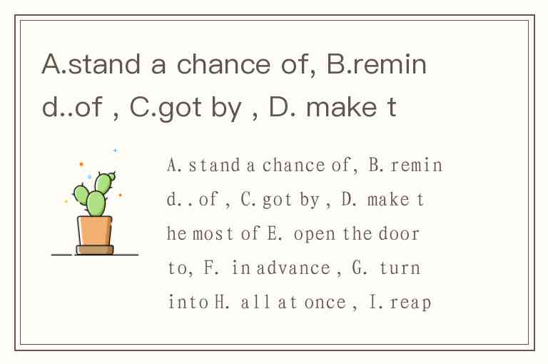 A.stand a chance of, B.remind..of , C.got by , D. make the most of E. open the door to, F. in advance , G. turn into H. all at once , I.reap the benefits of , J. over time They ---me--- my mother. My family--- on my father’s unemployment benefit after he lost his job. Research on genes will---exciting new medical treatments. Do you know how to --- the computer for your study Everything has been fixed ---. The bees---nectar--honey. We have been practicing for so long and so hard that our team should --- winning the . I was surprised, embarrassed, and dismayed ---. In order to --- the physical exercise, you have to exercise regularly, and for at least half an hour each time. Ground rents are likely to escalate ---.