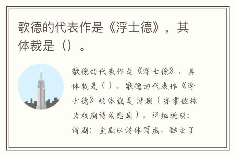 歌德的代表作《浮士德》的体裁是 诗剧(亦常被称为戏剧诗或悲剧)。