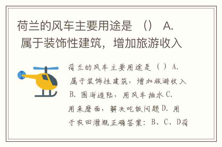 荷兰的风车主要用途是 () A. 属于装饰性建筑,增加旅游收入 B. 围海造陆,用风车抽水 C. 用来磨面,解决吃饭问题 D. 用于农田灌溉