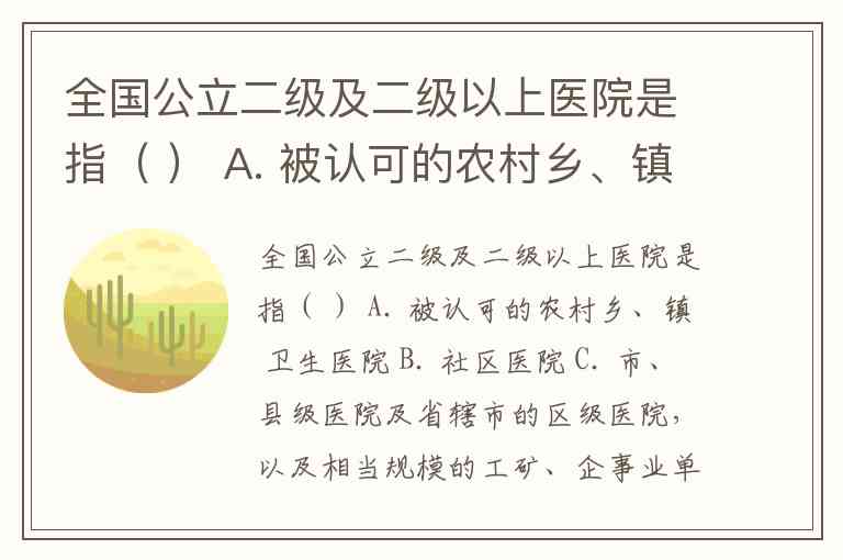 全国公立二级及二级以上医院是指( ) A. 被认可的农村乡、镇 卫生医院 B. 社区医院 C. 市、县级医院及省辖市的区级医院,以及相当规模的工矿、企事业单位的职工医院 D. 全国省、市、直辖的市级大医院及医学院校的附属医院