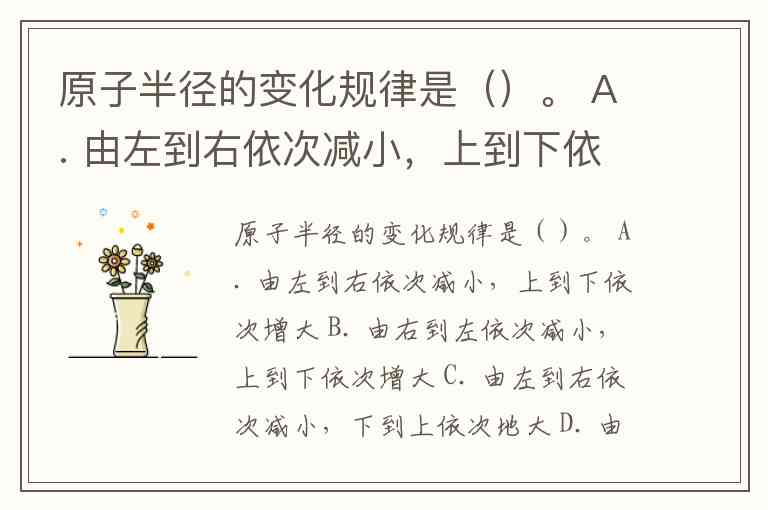 原子半径的变化规律是()。 A. 由左到右依次减小,上到下依次增大 B. 由右到左依次减小,上到下依次增大 C. 由左到右依次减小,下到上依次地大 D. 由右到左依次减小,下到上依次增大