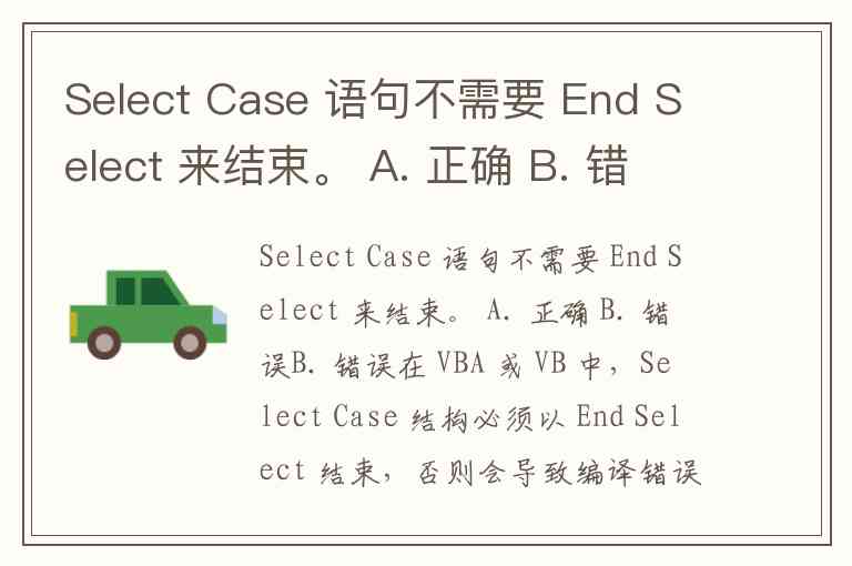 Select Case 语句不需要 End Select 来结束。 A. 正确 B. 错误