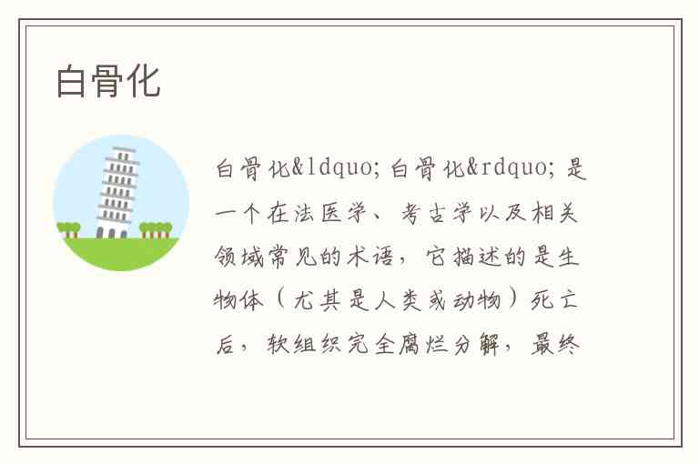 “白骨化”是一个在法医学、考古学以及相关领域常见的术语,它描述的是生物体(尤其是人类或动物)死亡后,软组织完全腐烂分解,最终仅剩下骨骼的过程。