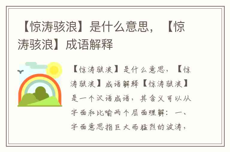 【惊涛骇浪】是一个汉语成语,其含义可以从字面和比喻两个层面理解: