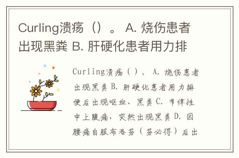 Curling溃疡()。 A. 烧伤患者出现黑粪 B. 肝硬化患者用力排便后出现呕血、黑粪 C. 节律性中上腹痛,突然出现黑粪 D. 因腰痛自服布洛芬(芬必得)后出现黑粪