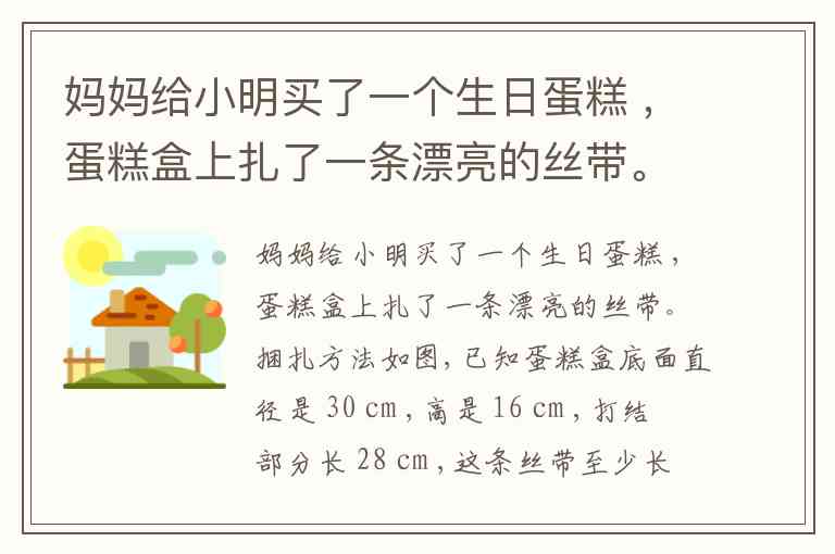妈妈给小明买了一个生日蛋糕 ,蛋糕盒上扎了一条漂亮的丝带。捆扎方法如图,已知蛋糕盒底面直径是 30 cm ,高是 16 cm ,打结部分长 28 cm ,这条丝带至少长( )。