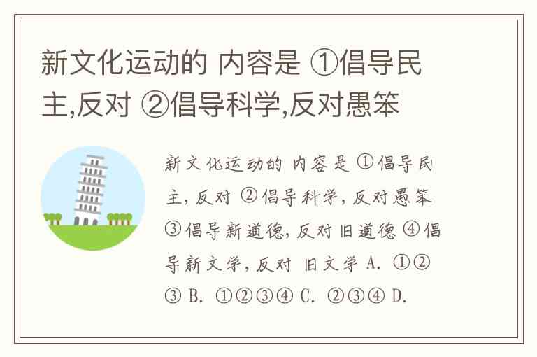 新文化运动的 内容是 ①倡导民主,反对 ②倡导科学,反对愚笨 ③倡导新道德,反对旧道德 ④倡导新文学,反对 旧文学 A. ①②③ B. ①②③④ C. ②③④ D. ①③④