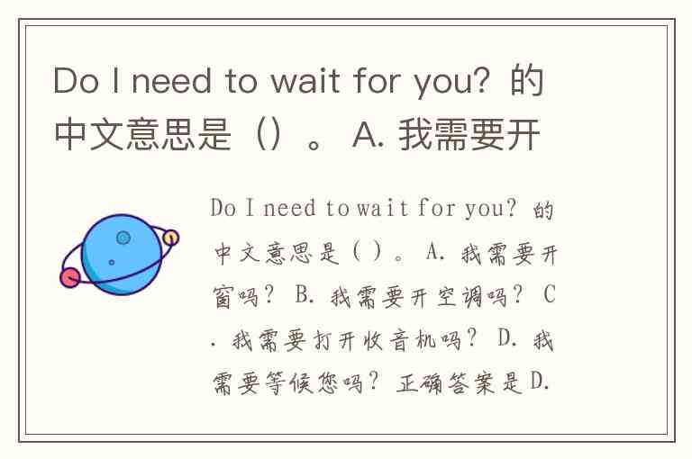 Do I need to wait for you?的中文意思是()。 A. 我需要开窗吗? B. 我需要开空调吗? C. 我需要打开收音机吗? D. 我需要等候您吗?