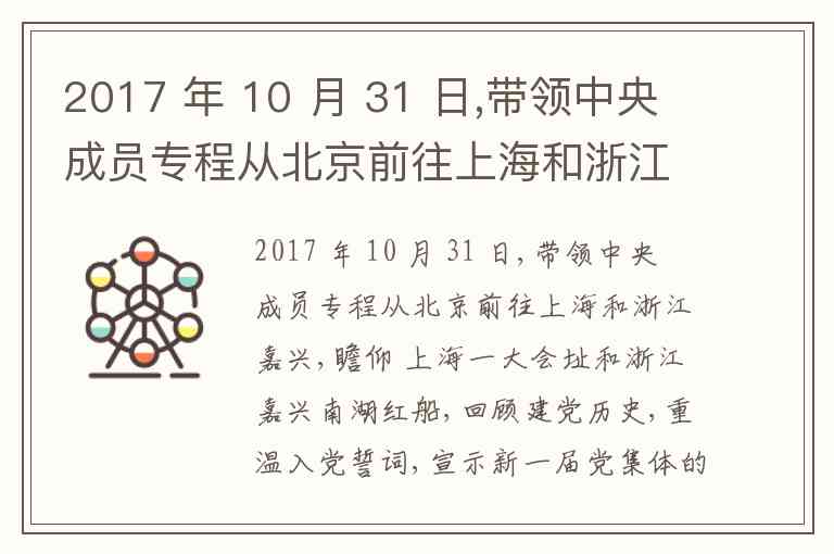 2017 年 10 月 31 日,中共中央总书记带领中央政治局常委专程前往上海和浙江嘉兴,瞻仰中共一大会址和南湖红船,回顾建党历史,并重温入党誓词,宣示新一届中央领导集体的坚定政治信念。