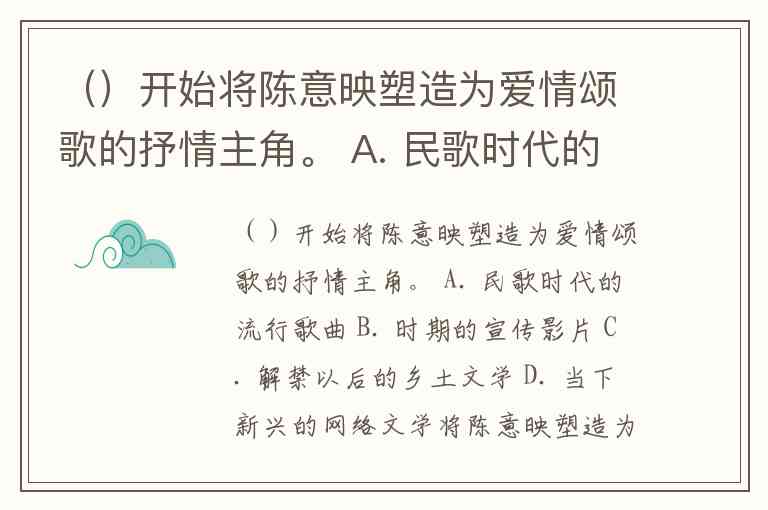 ()开始将陈意映塑造为爱情颂歌的抒情主角。 A. 民歌时代的流行歌曲 B. 时期的宣传影片 C. 解禁以后的乡土文学 D. 当下新兴的网络文学