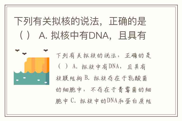 题干关键词:拟核——这是原核细胞中 DNA 所在的区域,没有核膜包被,其中 DNA 是裸露的环状分子,不与组蛋白形成染色体结构(除了某些古菌有类似组蛋白的结合,但典型原核生物如细菌无染色体结构)。