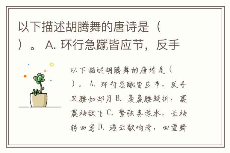 以下描述胡腾舞的唐诗是( )。 A. 环行急蹴皆应节,反手叉腰如却月 B. 袅袅腰疑折,褰褰袖欲飞 C. 繁弦奏渌水,长袖转回鸾 D. 遏云歌响清,回雪舞腰轻