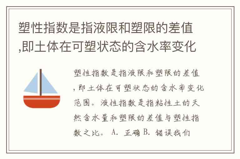 塑性指数是指液限和塑限的差值,即土体在可塑状态的含水率变化范围。液性指数是指粘性土的天然含水量和塑限的差值与塑性指数之比。 A. 正确 B. 错误