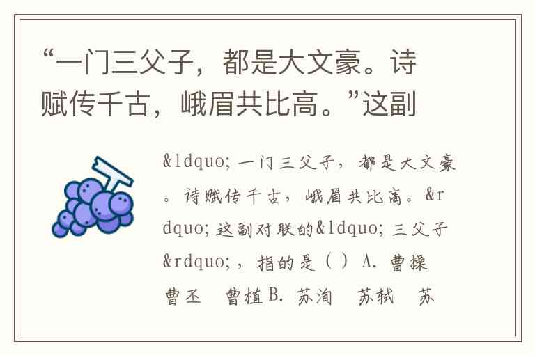 “一门三父子,都是大文豪。诗赋传千古,峨眉共比高。”这副对联的“三父子”,指的是() A. 曹操 曹丕 曹植 B. 苏洵 苏轼 苏辙 C. 班彪 班固 班超 D. 杜甫 杜牧 杜荀鹤