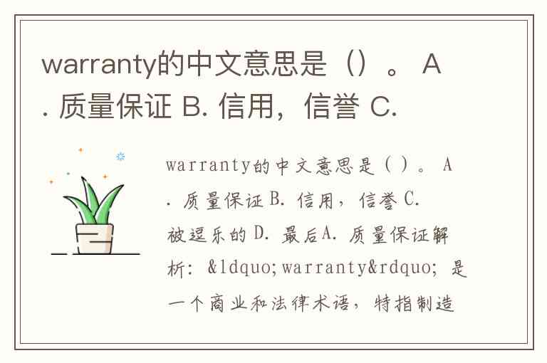 warranty的中文意思是()。 A. 质量保证 B. 信用,信誉 C. 被逗乐的 D. 最后