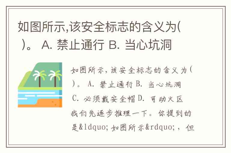 很多安全培训考试里,“如图所示”的标志如果是蓝底、白色安全帽图形,就是“必须戴安全帽”;如果是黄底三角形,坑洞图案,就是“当心坑洞”。