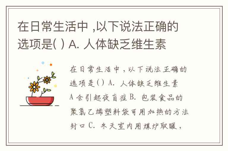 在日常生活中 ,以下说法正确的选项是( ) A. 人体缺乏维生素 A 会引起夜盲症 B. 包装食品的聚氯乙烯塑料袋可用加热的方法封口 C. 冬天室内用煤炉取暖 ,为防止煤气中毒 ,在煤炉上放一盆水 D. 图书档案着火 ,最好用干粉灭火器灭