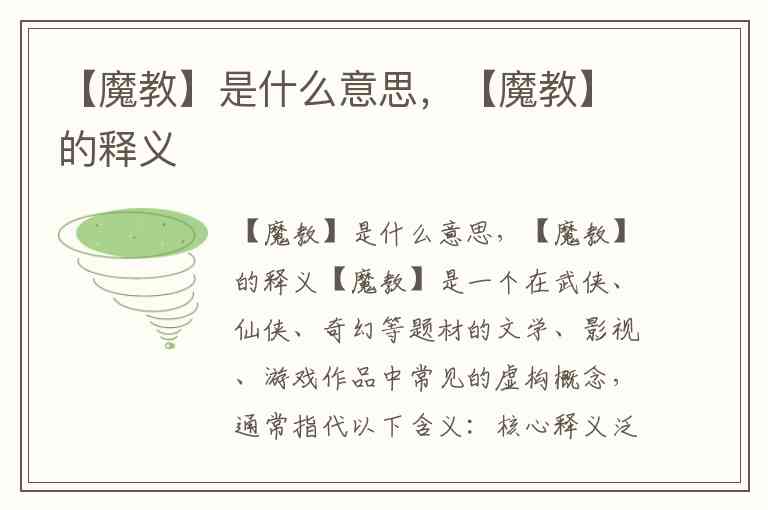【魔教】是一个在武侠、仙侠、奇幻等题材的文学、影视、游戏作品中常见的虚构概念,通常指代以下含义: