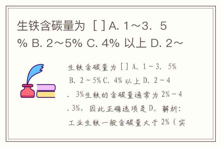 生铁含碳量为 [ ] A. 1~3.5% B. 2~5% C. 4% 以上 D. 2~4.3%