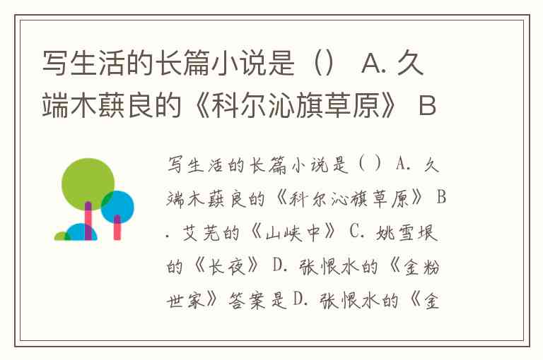A. 端木蕻良的《科尔沁旗草原》:虽然篇幅较长,但主要聚焦于东北草原上特定家族(丁家)的命运,地域和主题相对集中,更偏向于一部厚重的家族—乡土小说,其“生活”的广度不如选项D。