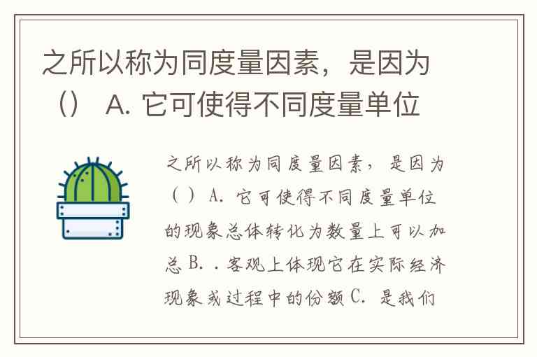 之所以称为同度量因素,是因为() A. 它可使得不同度量单位的现象总体转化为数量上可以加总 B. .客观上体现它在实际经济现象或过程中的份额 C. 是我们所要测定的那个因素 D. 它必须固定在相同的时期