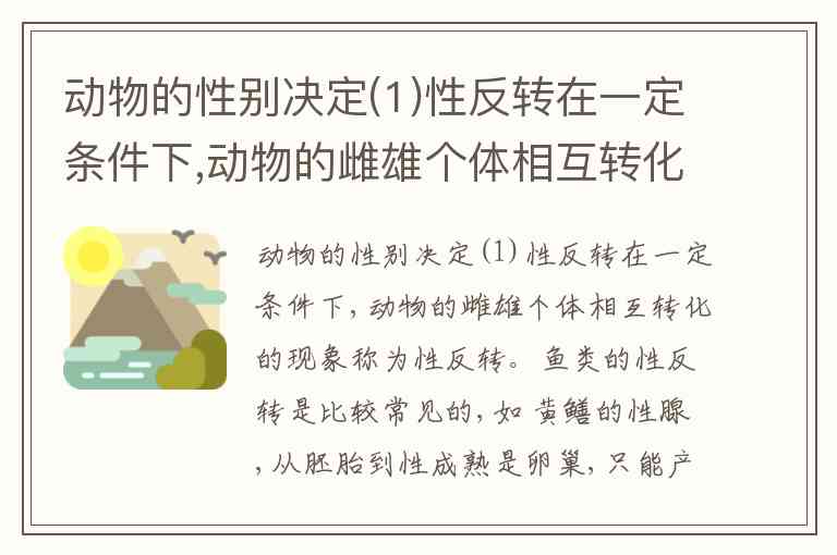 动物的性别决定(1)性反转在一定条件下,动物的雌雄个体相互转化的现象称为性反转。鱼类的性反转是比较常见的,如 黄鳝的性腺,从胚胎到性成熟是卵巢,只能产生卵细胞。产卵后的卵巢慢慢转化成精巢,只产生精 子。所以,每条黄鳝一生中都要经过雌雄两个阶段。成熟的雌鱼会出其不意地变成雄鱼,老的黄鳝 有时转变成雄鱼。主要的原因是鱼类存在着性别转化的物质条件,即生殖腺存在着尚未分化的部 分,所以在条件适宜时可以转变性别。(2)性别决定于温度有些动物的性别决定与温度有关。大多数龟类无性染色体,经研究发现,乌龟类在 20〜27 C条件下孵出的个体为雄性,在 30〜35 C时孵出的个体为雌性。鳄类在 30 C及以下温度孵化全为雌性,32 C时雌鳄则占85%雄鳄仅占15%且孵化时在第2周到第3周的温度是胚胎的性别决定 期。(3)性别与光照强度我国特产的活化石扬子鳄靠光照强弱来实现性别决定。巢穴建于潮湿阴暗的弱光处可孵出较多 雌鳄,巢穴建于阳光暴晒处,则可产生较多的雄性。[例5] 在XY型的性别决定中,决定后代性别的时期是( ) A. 精子形成过程中 B. 卵细胞形成过程中 C. 受精作用发生时 D. 受精卵分裂过程中