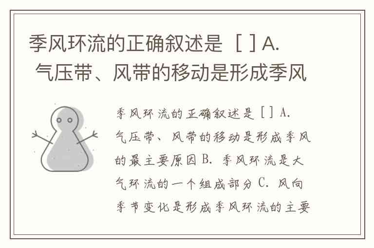 A. 气压带、风带的移动是形成季风的最主要原因 —— 不完全正确。季风形成的主要原因是海陆热力差异(尤其是东亚季风),以及气压带和风带的季节性移动(尤其是南亚的西南季风与热带季风),但只说“最主要原因”是气压带风带的移动并不准确,因为东亚季风主要成因是海陆热力差异。