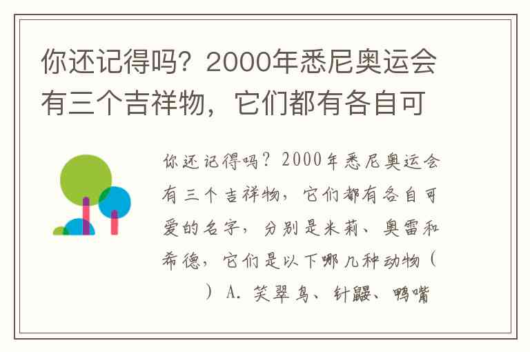 你还记得吗?2000年悉尼奥运会有三个吉祥物,它们都有各自可爱的名字,分别是米莉、奥雷和希德,它们是以下哪几种动物( ) A. 笑翠鸟、针鼹、鸭嘴兽 B. 袋鼠、鸭子、树袋熊 C. 袋鼠、针鼹、鸭嘴兽 D. 树袋熊、针鼹、鸭嘴兽
