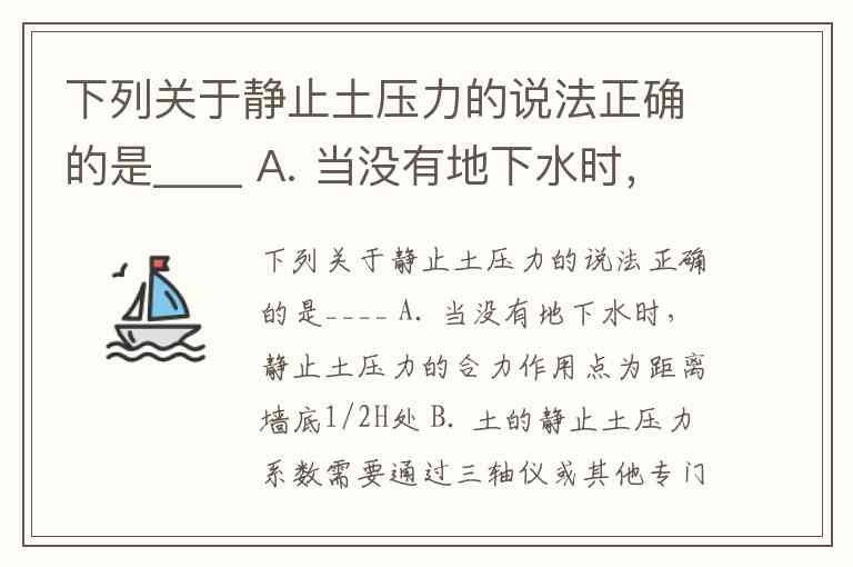 结合常见考试题,如果这是单选,往往选 B(因为 A 明显错,C 在有水时说法不严谨——因为实际计算静止土压力时,水位以下部分的侧压力要用浮重度计算土骨架部分,但静止土压力系数是否包含水压力部分要明确,有些教材认为应分开算土压力和水压力,所以“地下水位以下采用浮重度”会让人误解为总侧压力只计算 而不加水压力,与静止土压力的定义略有出入,可能被命题人认为错误)。