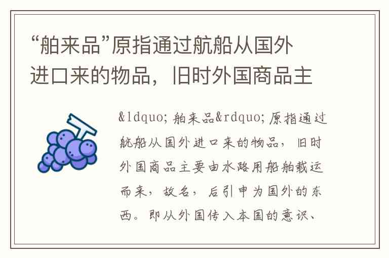 舶来品:最初指通过航船进口的外国物品,后泛指从外国传入本国的意识、物品、语言、文化、技术等。