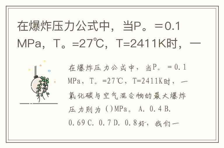 在爆炸压力公式中,当P。=0.1MPa,T。=27℃,T=2411K时,一氧化碳与空气混合物的最大爆炸压力则为 ( )MPa。 A. 0.4 B. 0.69 C. 0.7 D. 0.8