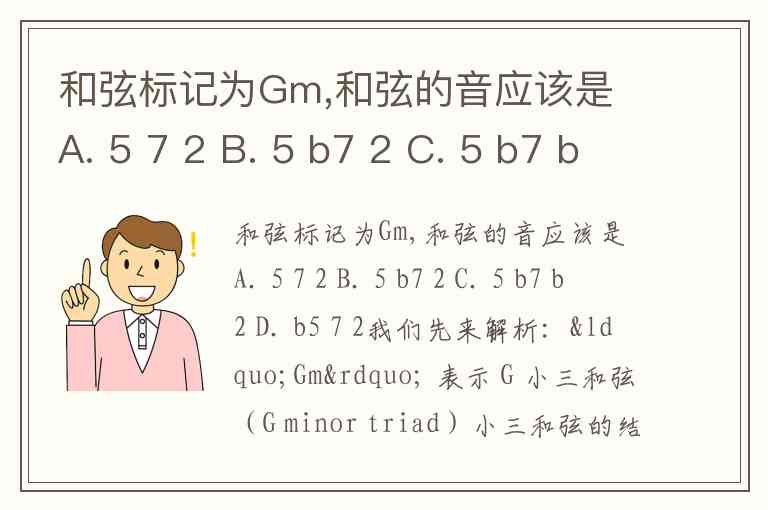 和弦标记为Gm,和弦的音应该是 A. 5 7 2 B. 5 b7 2 C. 5 b7 b2 D. b5 7 2