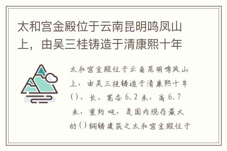 太和宫金殿位于云南昆明鸣凤山上,由吴三桂铸造于清康熙十年( ),长、宽各 6.2 米,高 6.7 米,重约 吨,是国内现存最大的( )铜铸建筑之
