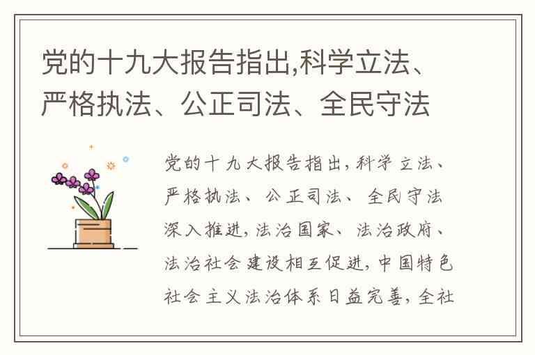 党的十九大报告原文为:“科学立法、严格执法、公正司法、全民守法深入推进,法治国家、法治政府、法治社会建设相互促进,中国特色社会主义法治体系日益完善,全社会法治观念明显增强。”