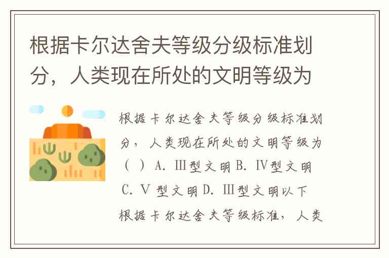 根据卡尔达舍夫等级分级标准划分,人类现在所处的文明等级为( ) A. Ⅰ型文明 B. Ⅱ型文明 C. Ⅲ型文明 D. Ⅰ型文明以下