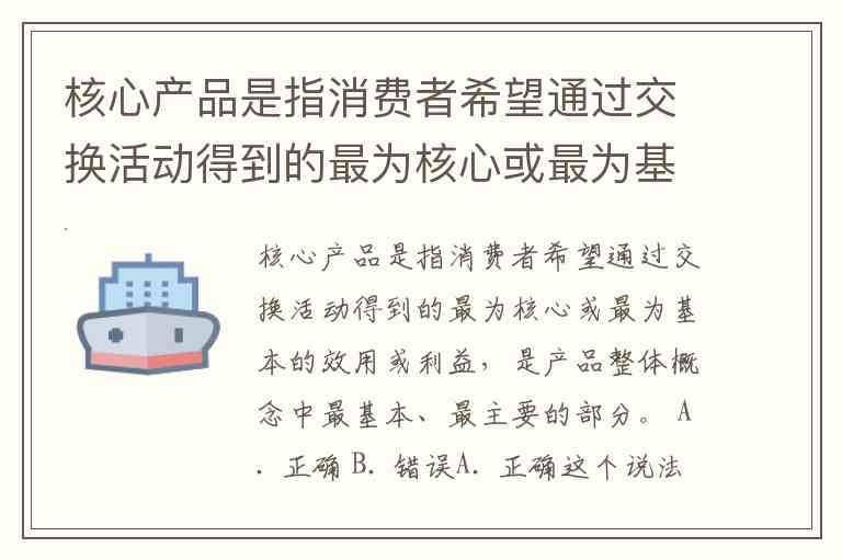 核心产品是指消费者希望通过交换活动得到的最为核心或最为基本的效用或利益,是产品整体概念中最基本、最主要的部分。 A. 正确 B. 错误