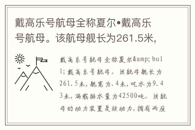 戴高乐号航母全称夏尔•戴高乐号航母。该航母舰长为261.5米,舰宽为.4米,吃水为9.43米,满载排水量为42500吨。该航母的动力装置是核动力,拥有两座核反应堆。航母的食物储量可供1750人食用45天,该航母最大航速为25节。 A. 正确 B. 错误