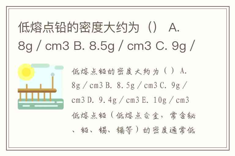 低熔点铅的密度大约为() A. 8g/cm3 B. 8.5g/cm3 C. 9g/cm3 D. 9.4g/cm3 E. 10g/cm3