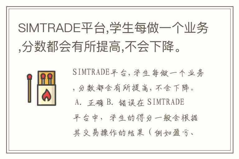 SIMTRADE平台,学生每做一个业务,分数都会有所提高,不会下降。 A. 正确 B. 错误