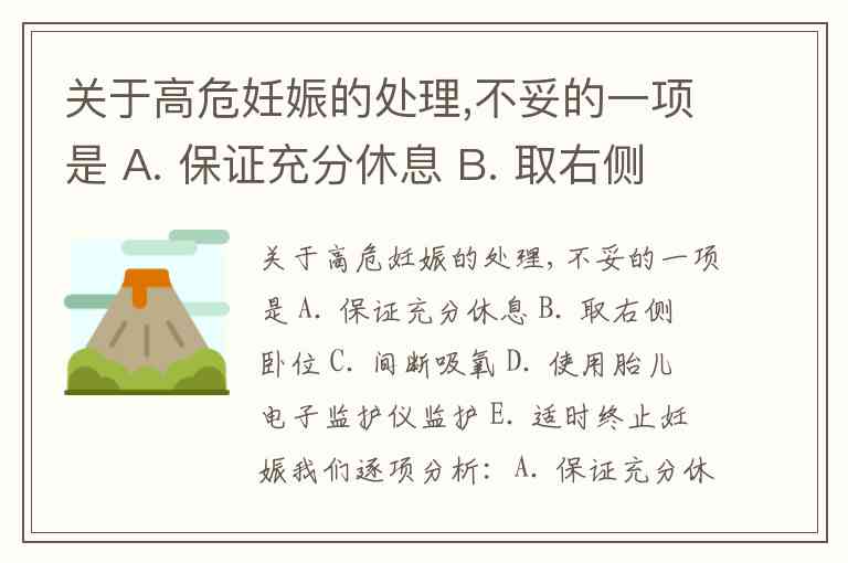 关于高危妊娠的处理,不妥的一项是 A. 保证充分休息 B. 取右侧卧位 C. 间断吸氧 D. 使用胎儿电子监护仪监护 E. 适时终止妊娠
