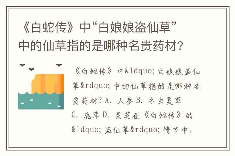 《白蛇传》中“白娘娘盗仙草”中的仙草指的是哪种名贵药材? A. 人参 B. 冬虫夏草 C. 鹿茸 D. 灵芝