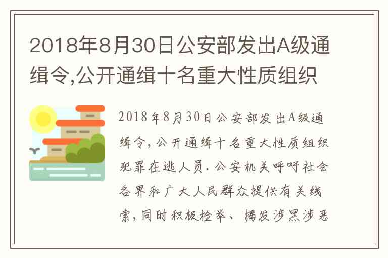 2018年8月30日公安部发出A级通缉令,公开通缉十名重大性质组织犯罪在逃人员 → 这是国家机关在依法打击犯罪,履行政治统治职能和社会管理职能。