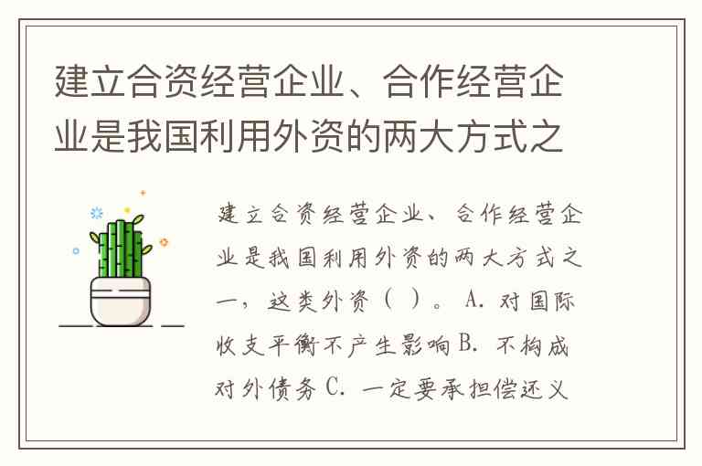 建立合资经营企业、合作经营企业是我国利用外资的两大方式之一,这类外资( )。 A. 对国际收支平衡不产生影响 B. 不构成对外债务 C. 一定要承担偿还义务 D. 要用外汇或出口产品偿还本金和利息
