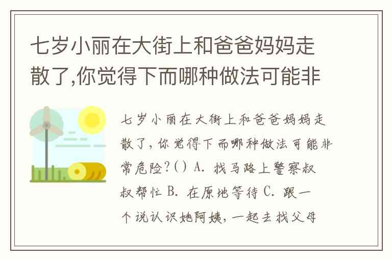 七岁小丽在大街上和爸爸妈妈走散了,你觉得下而哪种做法可能非常危险?( ) A. 找马路上警察叔叔帮忙 B. 在原地等待 C. 跟一个说认识她阿姨,一起去找父母 D. 打电话给爸爸妈妈